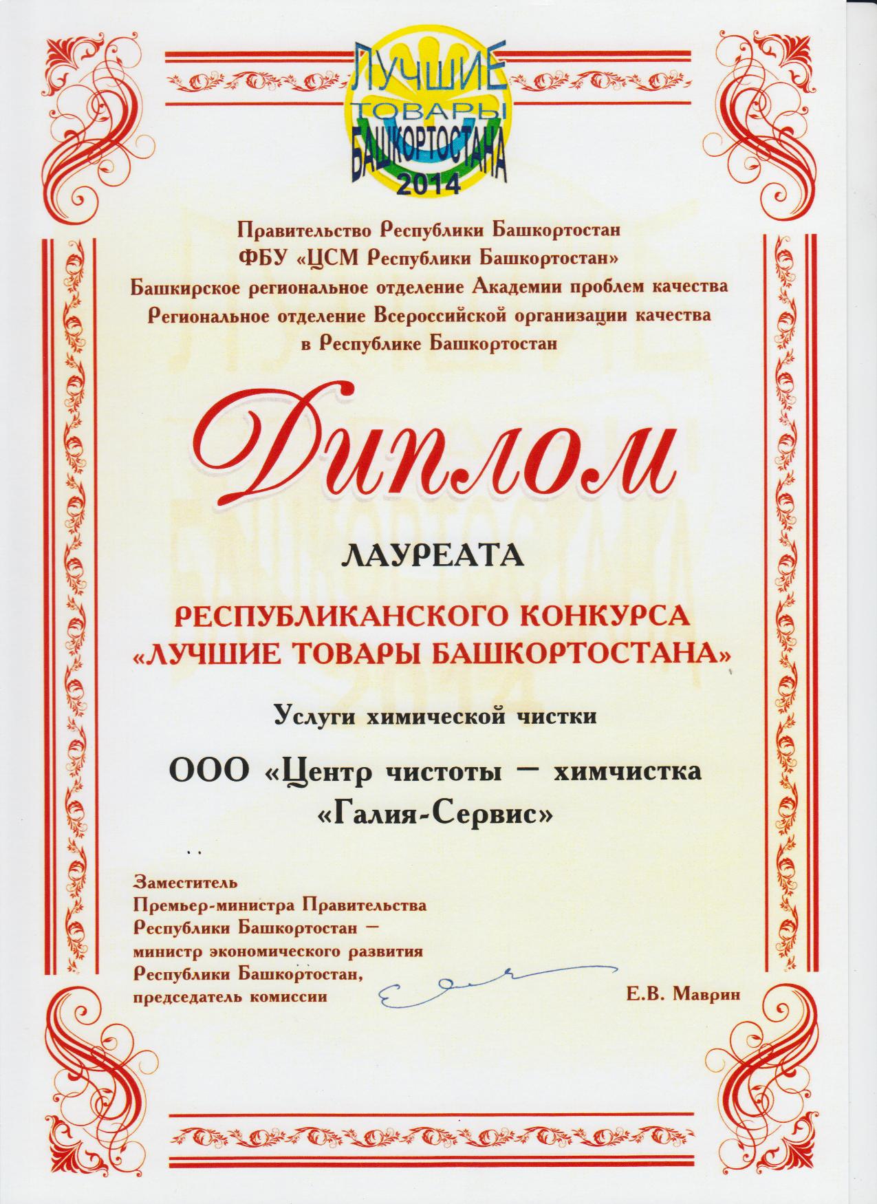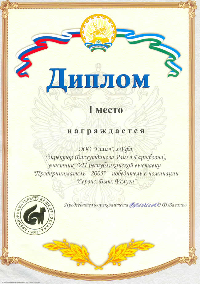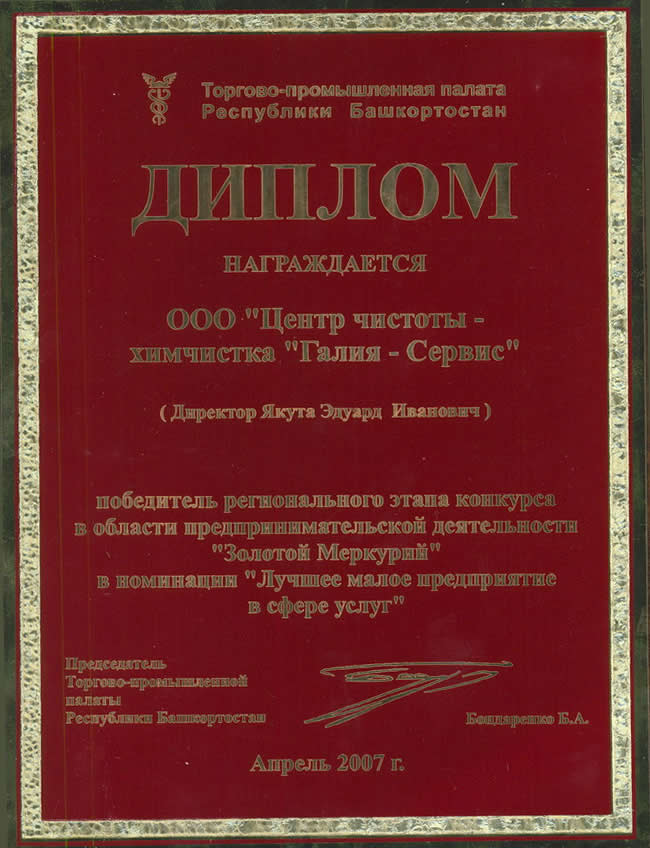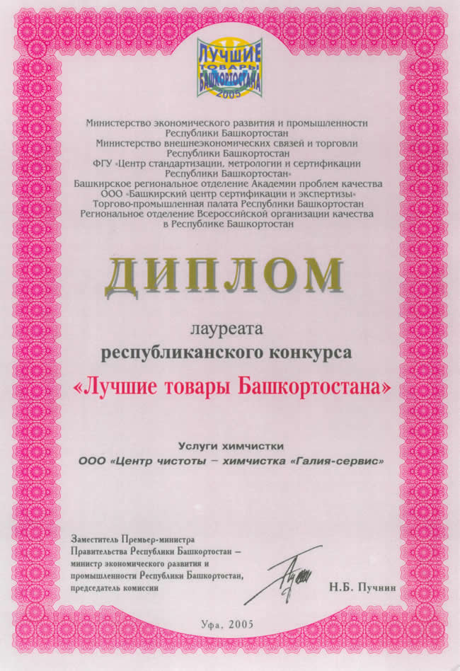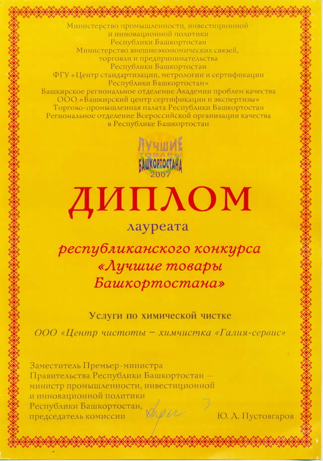- лауреат республиканского конкурса «Лучшие товары Башкортостана» в номинации «Услуги по химической чистке».