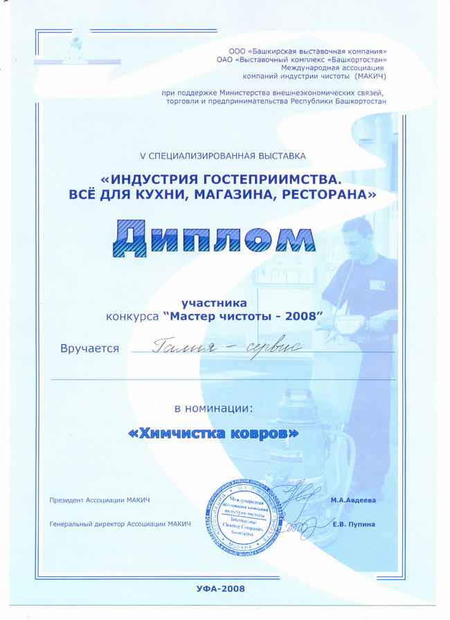 - диплом участника конкурса «Мастер чистоты – 2008» V специализированной выставки «Индустрия гостеприимства. Все для кухни, магазина, ресторана» в номинации «Химчистка ковров»