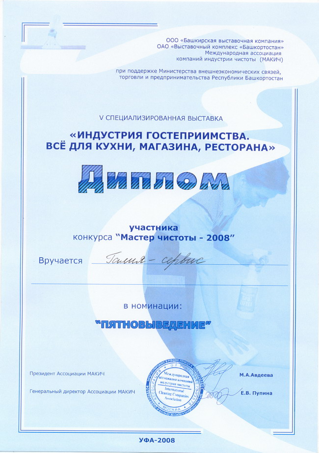 - диплом участника конкурса «Мастер чистоты – 2008» V специализированной выставки «Индустрия гостеприимства. Все для кухни, магазина, ресторана» в номинации «Пятновыведение»