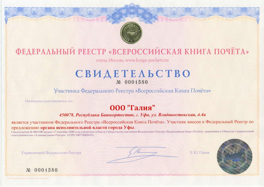 - свидетельство Участника Федерального Реестра «Всероссийская Книга Почета»
