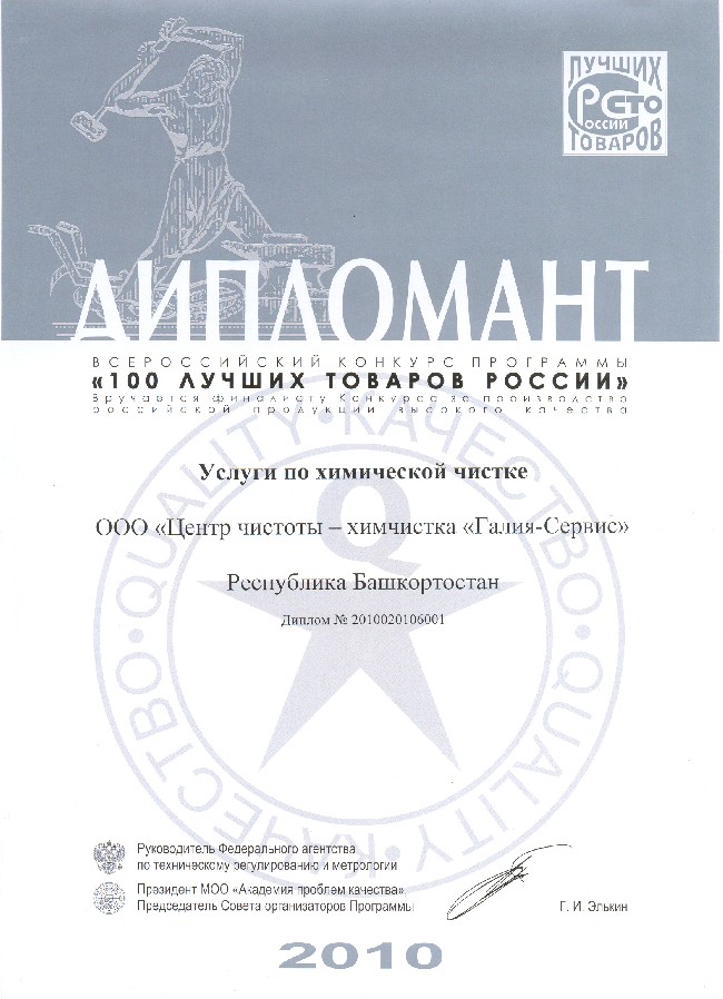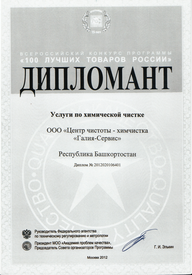 – дипломант программы «100 лучших товаров России» в номинации «Услуги по химической чистке».